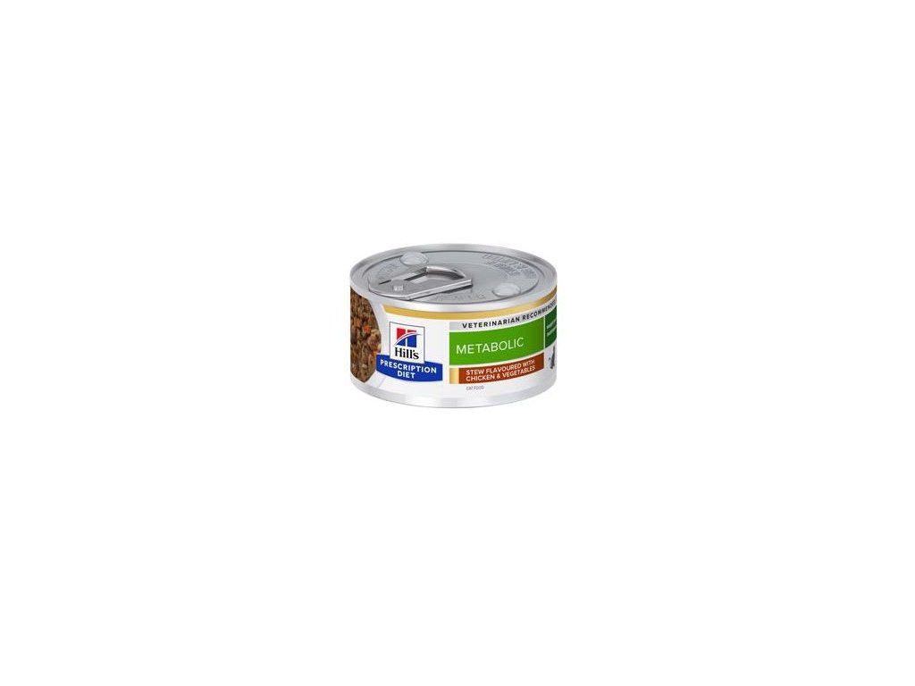 Hill's PRESCRIPTION DIET Metabolic Stew krmivo pro kočky s příchutí kuřete a zeleninou je kompletní dietetické krmivo pro snížení nadměrné tělesné hmotnosti a udržení zdravé hmotnosti u dospělých koček. Toto krmivo má nízkou hustotu energie.