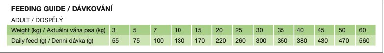 NÁVOD K POUŽITÍ: Jídlo podávejte suché, nebo zalité vodou. Po úvodním období krmte svého psa denními dávkami podle hmotnosti psa na tabulce. Doporučená denní porce je pouze orientační. Množství denního krmiva závisí na kondici a věku psa. Pokud má pes nadváhu, snižte denní porce o 10 %. Pokud má pes podváhu, zvyšte denní dávku o 10%. Vždy by měla být k dispozici čistá, čerstvá voda. Skladujte na suchém místě.