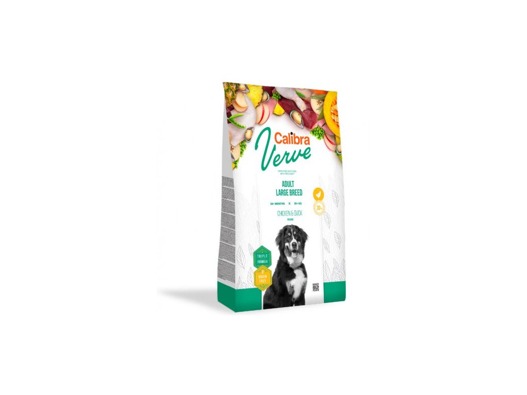 Calibra Dog Verve Adult Large Breed (Chicken & Duck) je kompletní suché krmivo s čerstvým masem a bez obilovin. Receptura je určena pro dospělé psy velkých plemen s hmotností nad 30 kg. 30 % čerstvého kuřecího masa a kvalitní kachní protein zaručují psovi optimální dávku zdravé výživy. Krmivo odpovídá nejvyšším požadavkům na přirozené stravování psa v souladu s jeho fyziologickými potřebami.