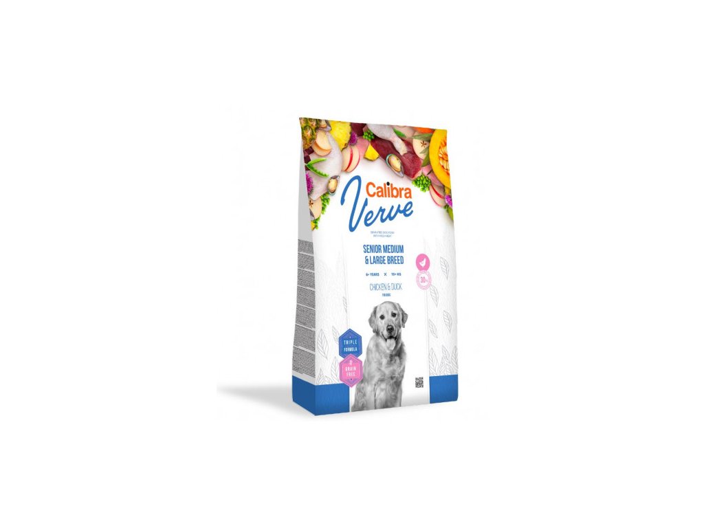 Calibra Dog Verve Senior Medium & Large Breed (Chicken & Duck) je kompletní suché krmivo s čerstvým masem a bez obilovin. Receptura je určená pro dospělé psy nad 6 let středních a velkých plemen o hmotnosti 10–90 kg. S obsahem 30 % čerstvého kuřecího masa v kombinaci s luxusním kachním proteinem je krmivo, které odpovídá nejvyšším požadavkům na přirozené stravování psa, v souladu s jeho fyziologickými potřebami. Adekvátní výživa pro zralého psa je doplněna o zvýšené množství chondroprotektivních látek pro namáhané klouby větších pejsků.
