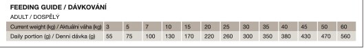 NÁVOD K POUŽITÍ: Jídlo podávejte suché, nebo zalité vodou. Po úvodním období krmte svého psa denními dávkami podle hmotnosti psa na tabulce. Doporučená denní porce je pouze orientační. Množství denního krmiva závisí na kondici a věku psa. Pokud má pes nadváhu, snižte denní porce o 10 %. Pokud má pes podváhu, zvyšte denní dávku o 10%. Vždy by měla být k dispozici čistá, čerstvá voda. Skladujte na suchém místě.