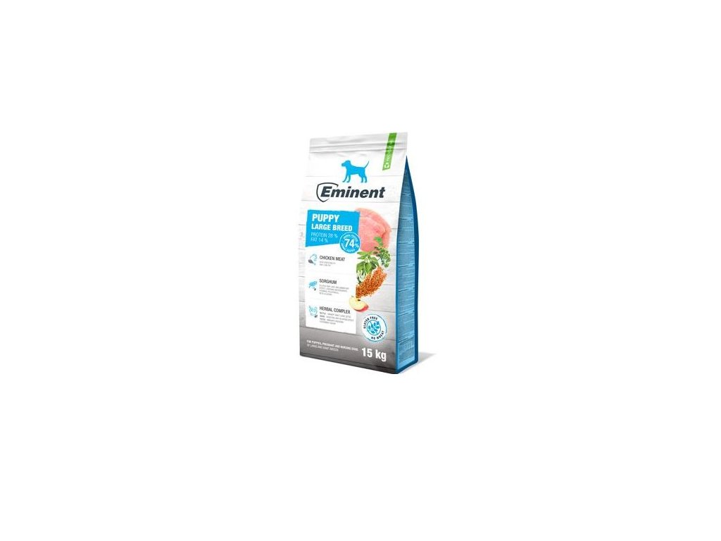 Krmivo pro štěňata, březí a kojící feny velkých a obřích plemen Eminent. Krmivo splňuje nároky na výživu rychle rostoucích štěňat velkých plemen. Základem receptury, která zajišťuje optimální růst svalové hmoty, je kvalitní lehce stravitelné kuřecí maso.
