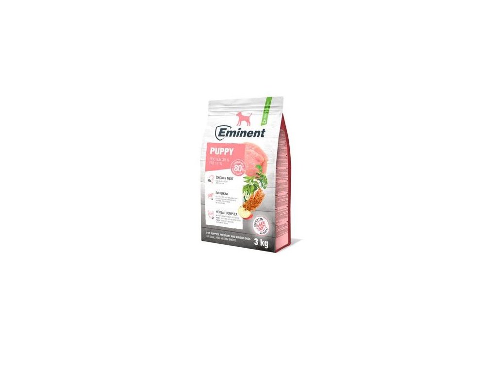 Eminent krmivo pro štěňata, březí a kojící feny malých a středních plemen. Malá a střední plemena dosahují dospělosti dříve než štěňata velkých plemen. Tato receptura respektuje jejich požadavky na vyšší obsah bílkovin, tuků (kvalitní drůbeží tuk a kokosový olej) a vitamínů.