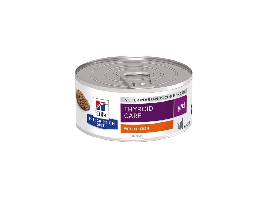 Hill's Prescription Diet y/d pro kočky s kuřetem (7 %) je kompletní dietetické krmivo pro dospělé kočky, které omezuje příjem jódu v případě hypertyreózy. Dietetické krmivo se sníženým obsahem jódu.
